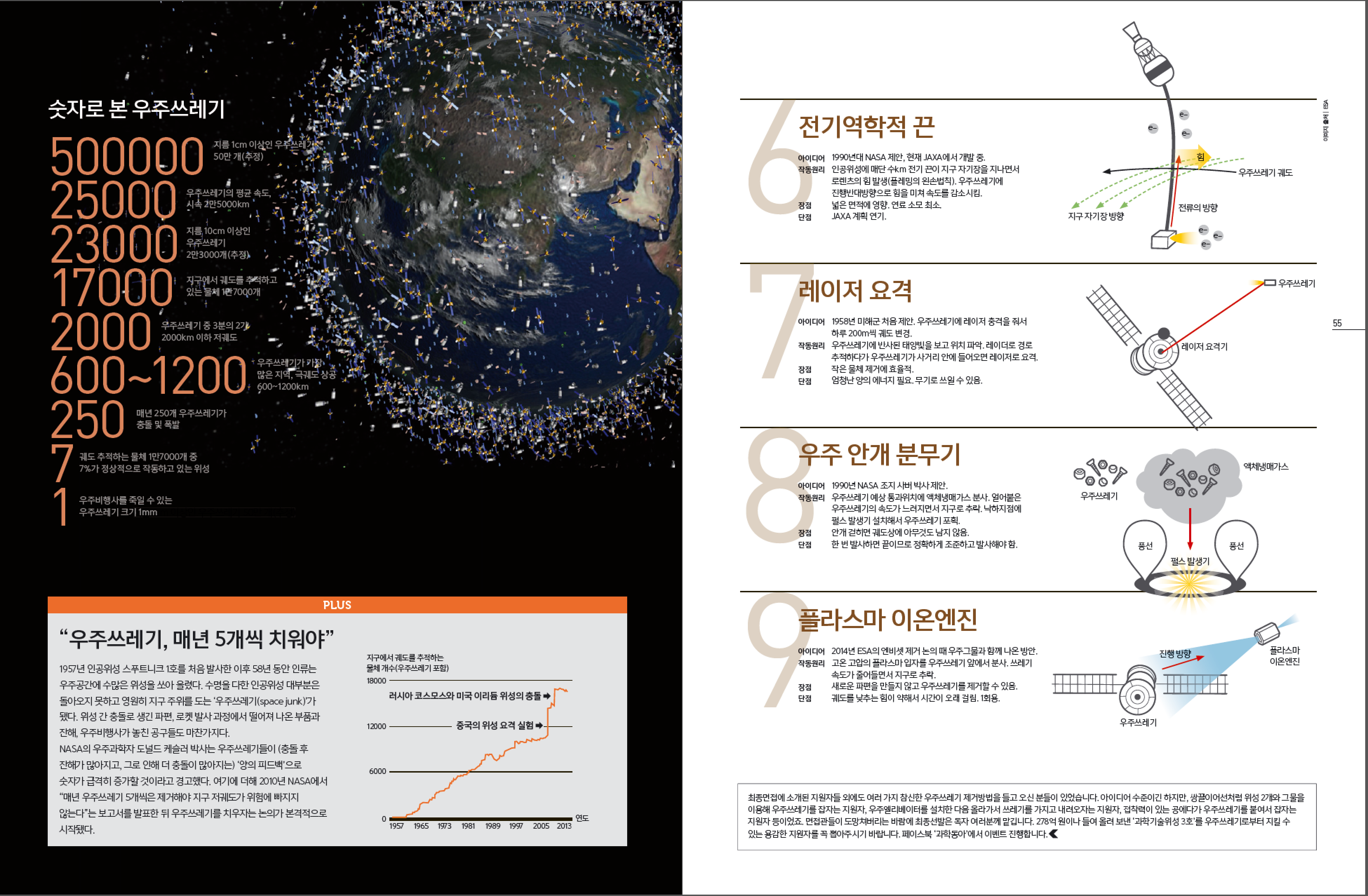정말 신선한 기사였다. 우주에 대한 기사를 많이 다뤄봤지만 우주쓰레기가 저렇게 많고 해결방법에 대한 고민도 하고 있다는 사실이 신선했기 때문이다. 우주쓰레기를 해결하는 방법에 대한 5가지 유력한 이론들을 다루고 그 외 기상천외한 아이디어들은 인포그래픽으로 과정을 보여주는것으로 작업을 하였다.