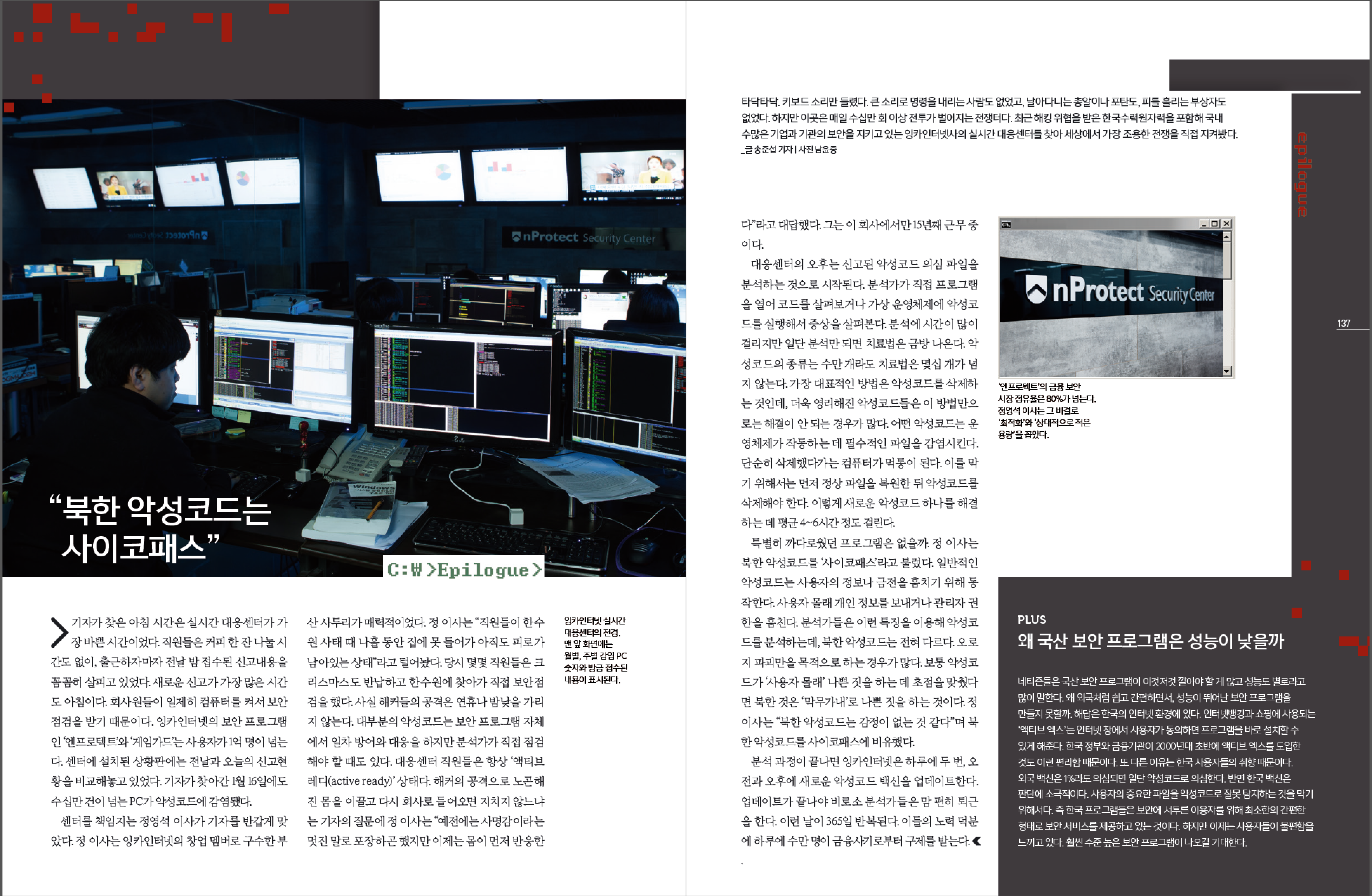 테러받진 않을지 가슴 떨려하며 작업한 기사. 북한 김정은 위원장의 얼굴을 감히 표지에... 각 나라의 수장의 얼굴을 과감하게 반쪽씩 배치하여 대치상황을 알리고 사이버라는 느낌이 날 수 있게 픽셀화 작업을 했다. 지금 봐도 표지는 정말.. 대담하게 작업한 느낌이 든다. 뭔깡으로..;; 내지 부분도 픽셀 느낌을 넣어 사이버 공간의 느낌을 주고자 하였다.