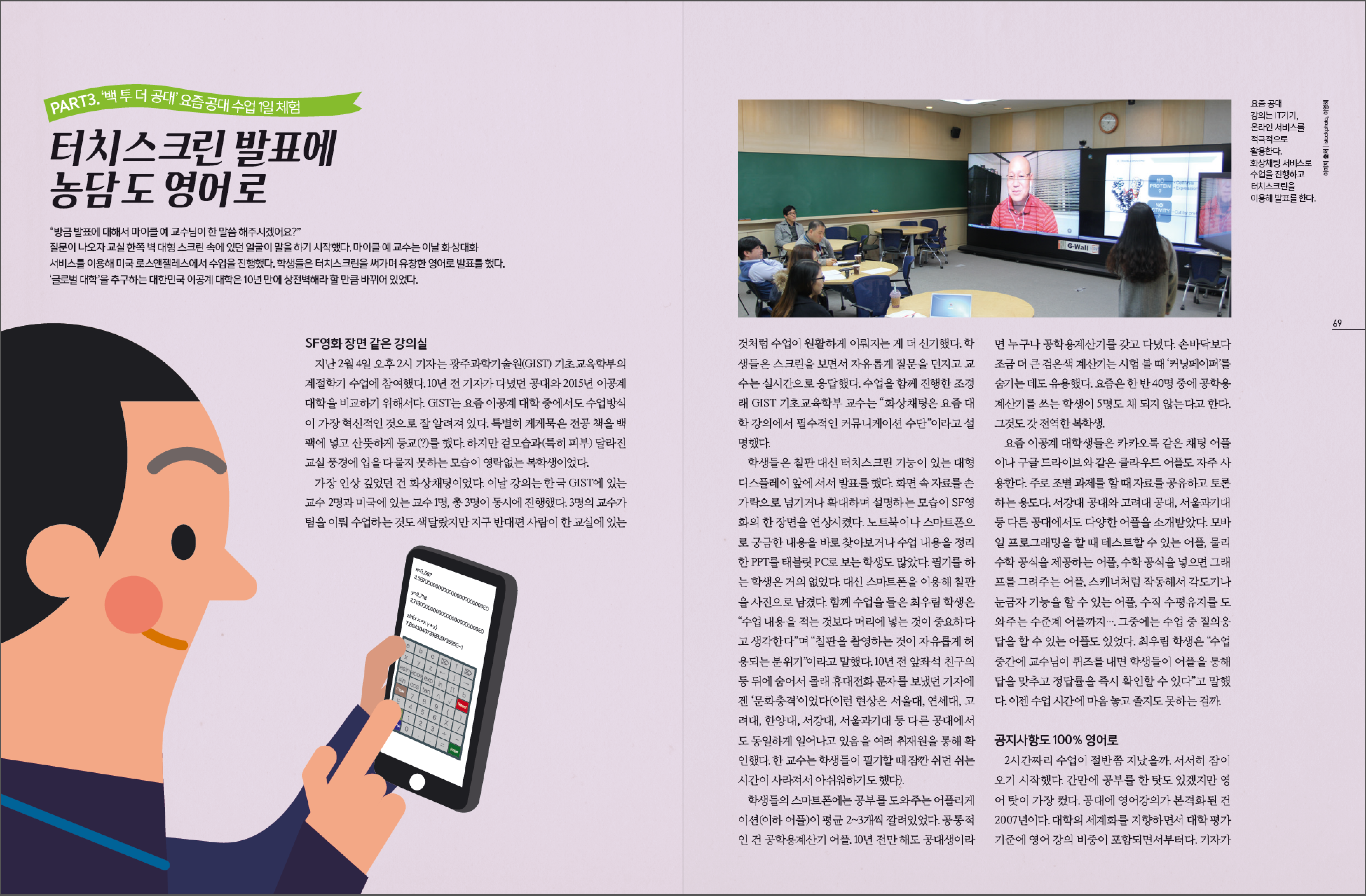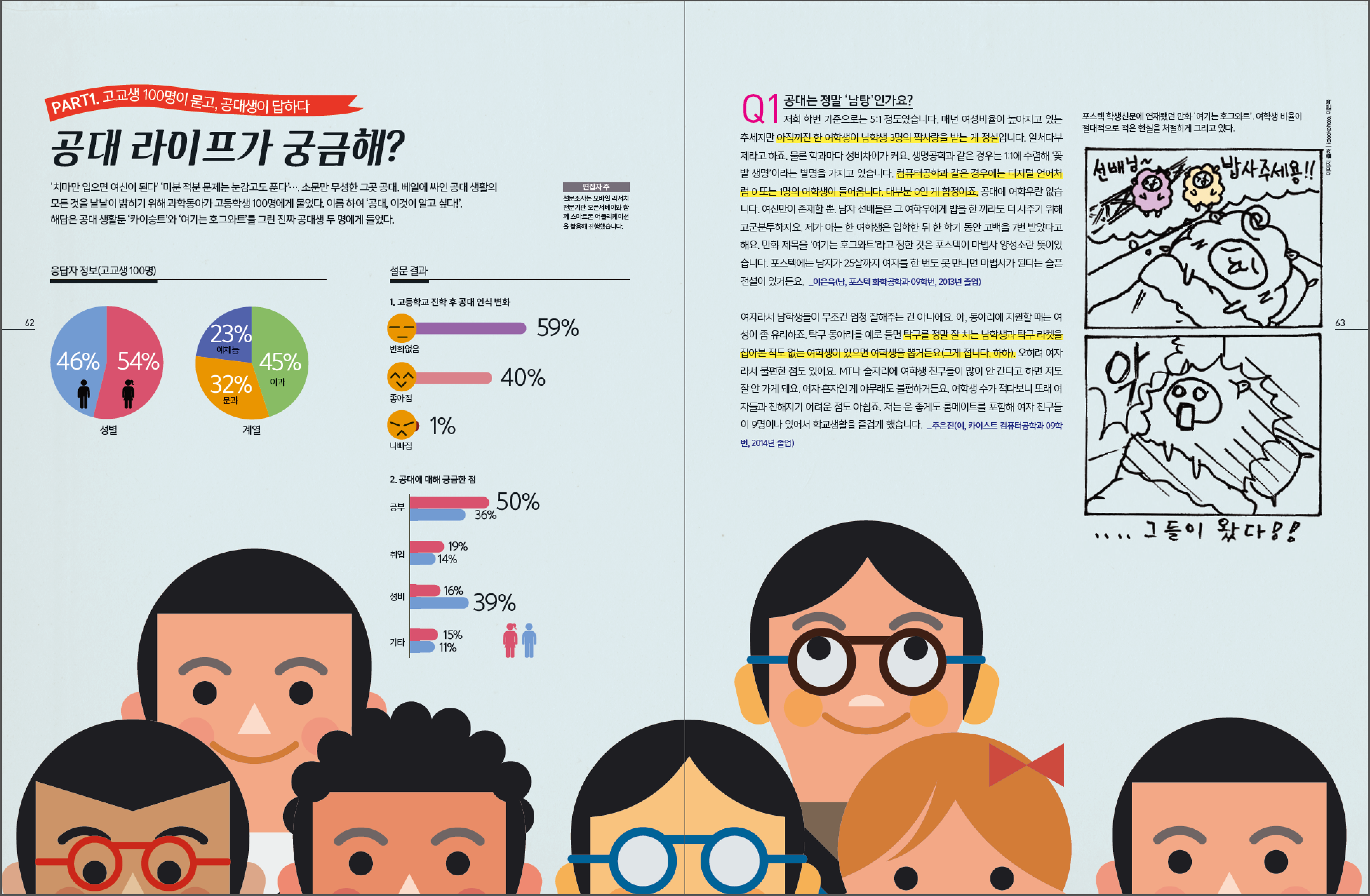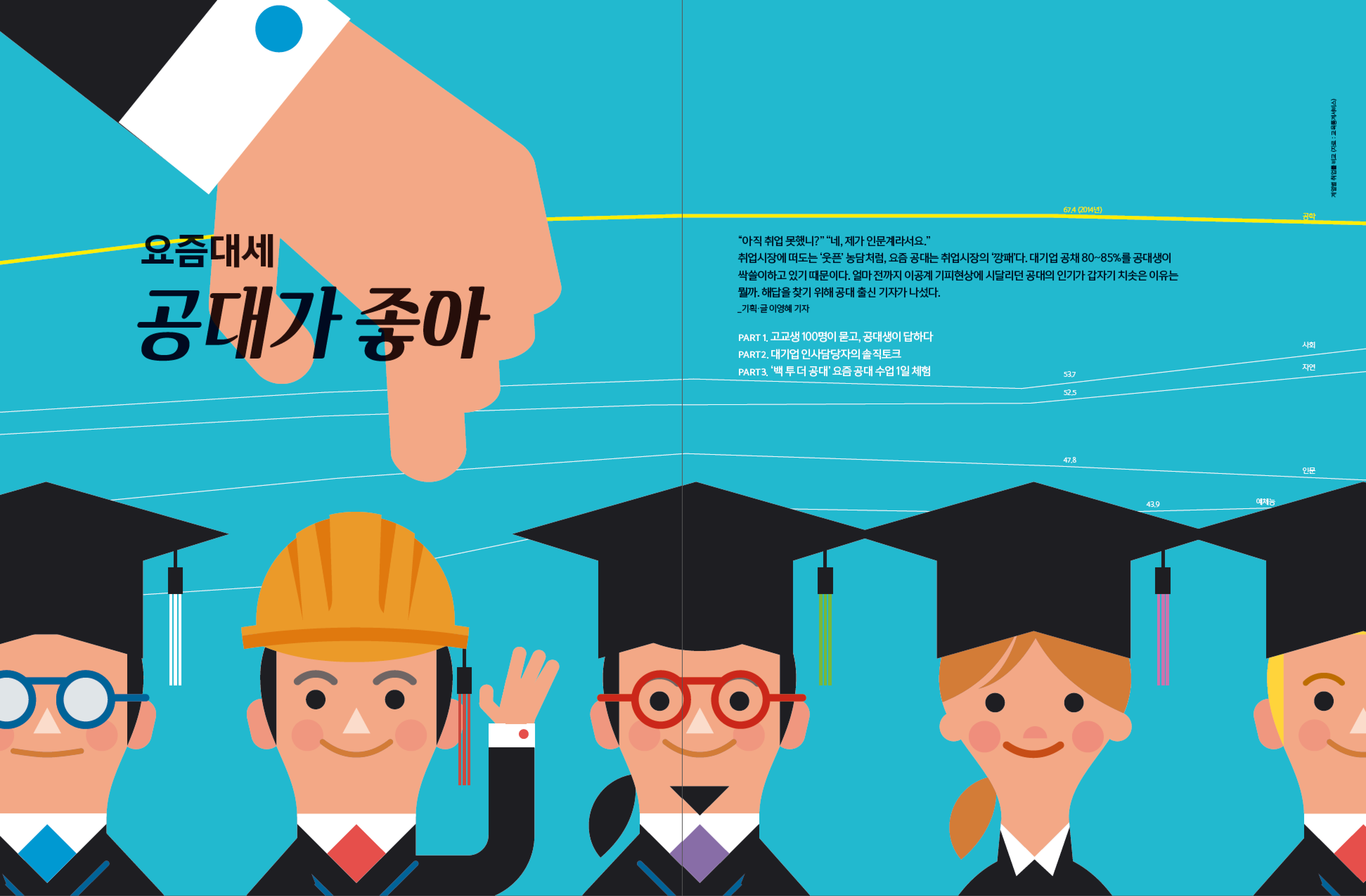 한 땀 한 땀 일러스트를 제작하여 과감하게 배치함으로 발랄한 느낌을 주고자 하였다. 요새 뜨는 과중 하나인 공대에 대한 이모저모의 이야기를 담은 기사인데 공대생의 에피소드를 담은 카툰도 너무 재밌어서 즐거운 마음으로 일하였다. 표지 부분에는 취업이 잘된다는 공대생의 이미지를 비주얼로 표현하면서 뒷배경엔 취업률 그래프를 같이 넣어주어 표지를 구성하였다.