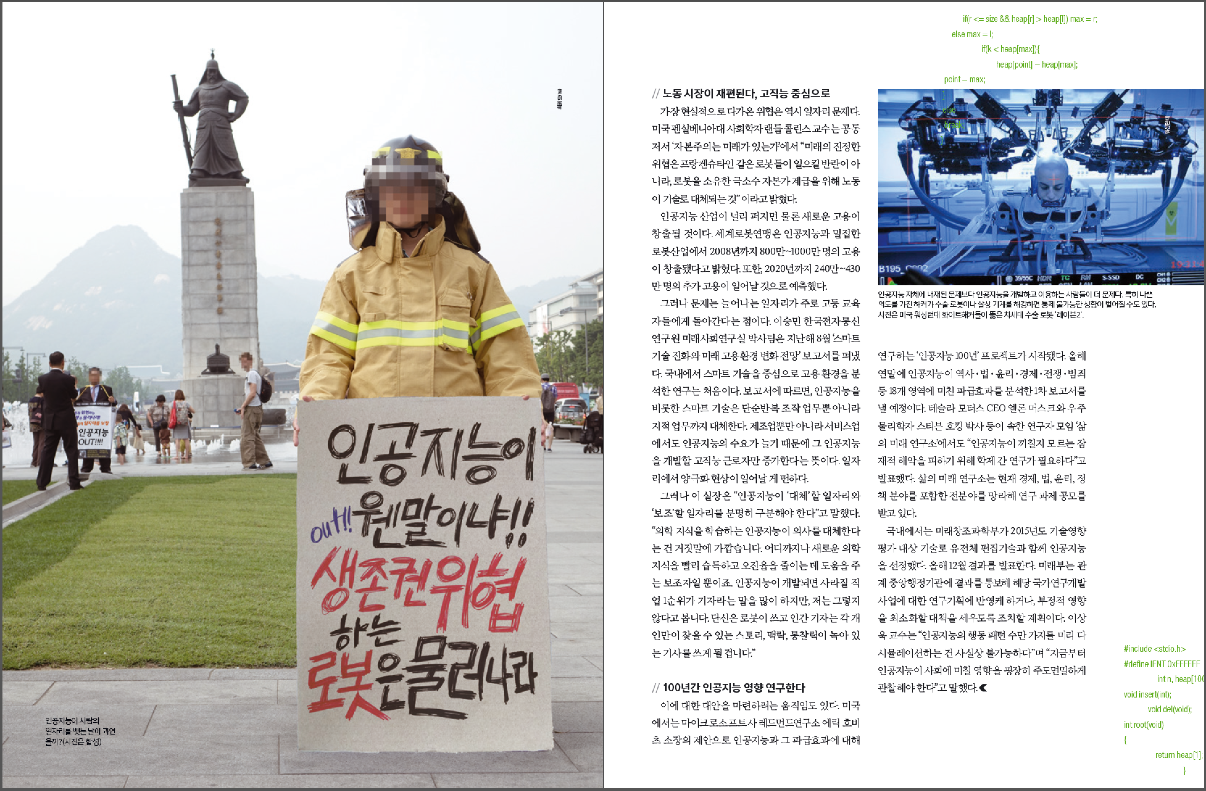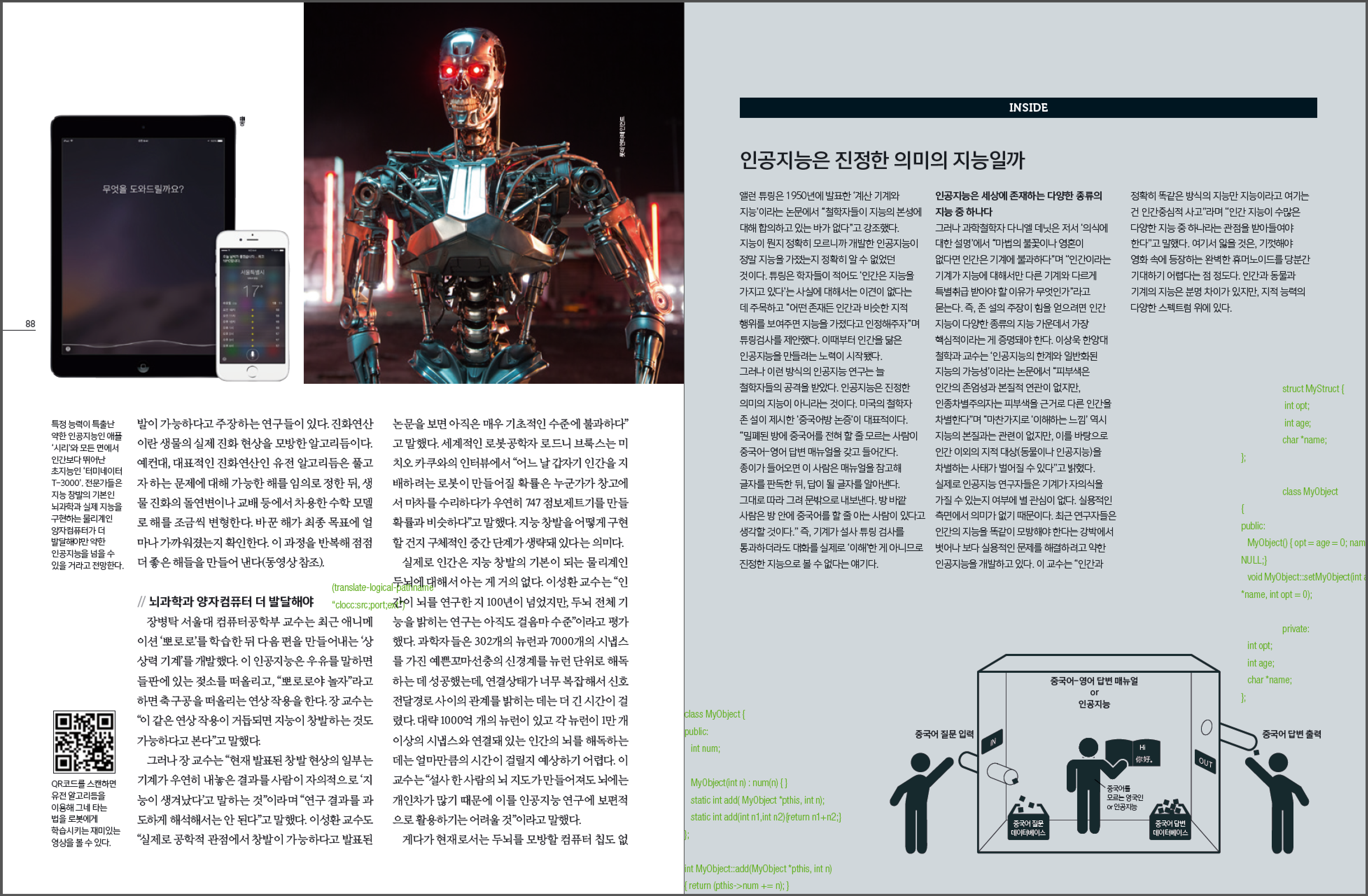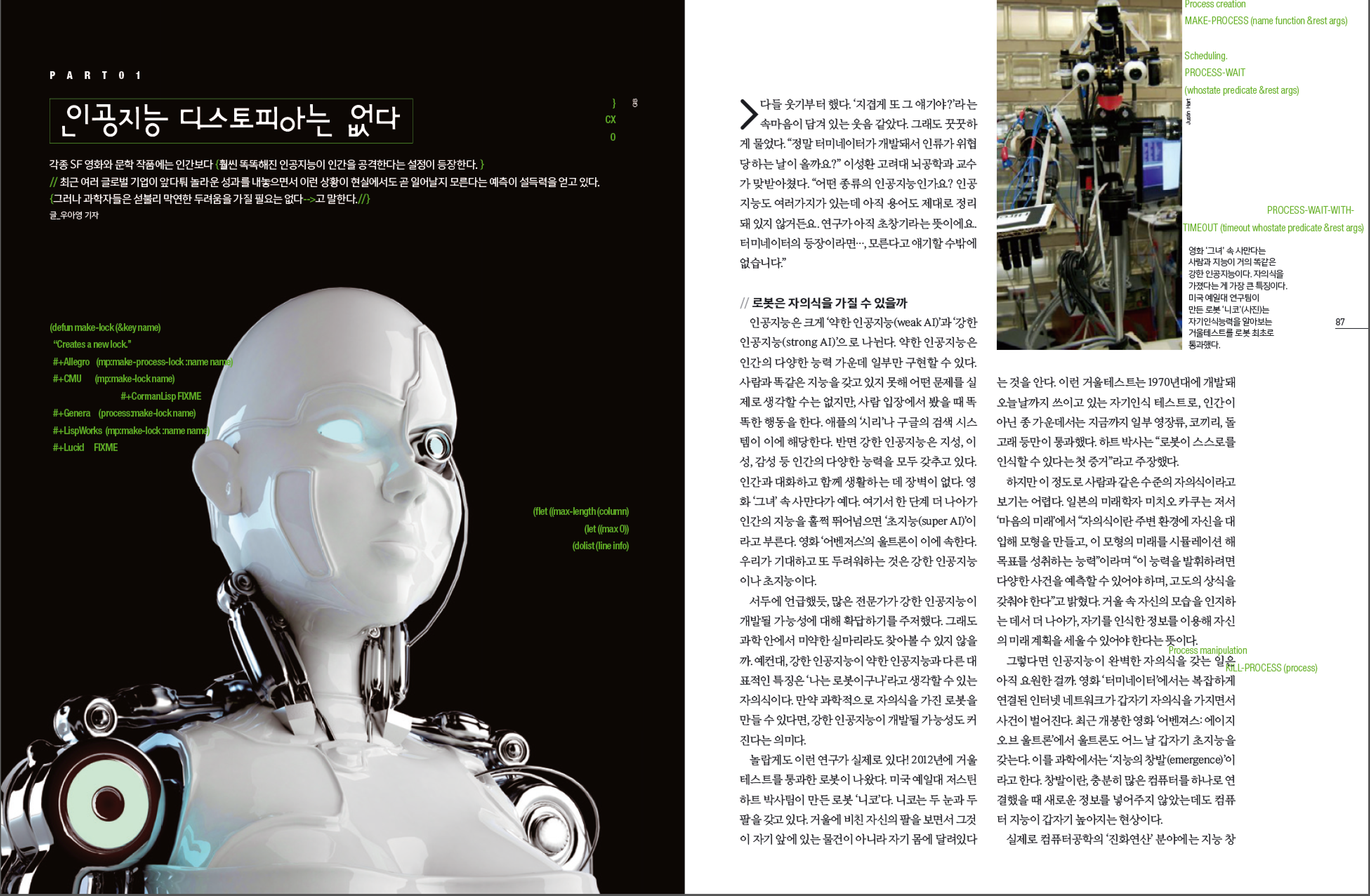 인공지능, 로봇의 느낌을 표현하기 위해 코드를 사용하여 본문 중간중간에 비주얼 소스로 사용했고 탈폰트(?)를 사용하여 각 음절이 코드처럼 보이게 하기 위해 연출했다. 인공지능개발연대기 인포그래픽부분에서는 처음 이론이 나온 시점과 개발연구가 시작된 연도가 꽤 오랜텀이 있는걸 이용해 페이지의 전체 지면을 활용해 기간의 텀을 표현해보았다.