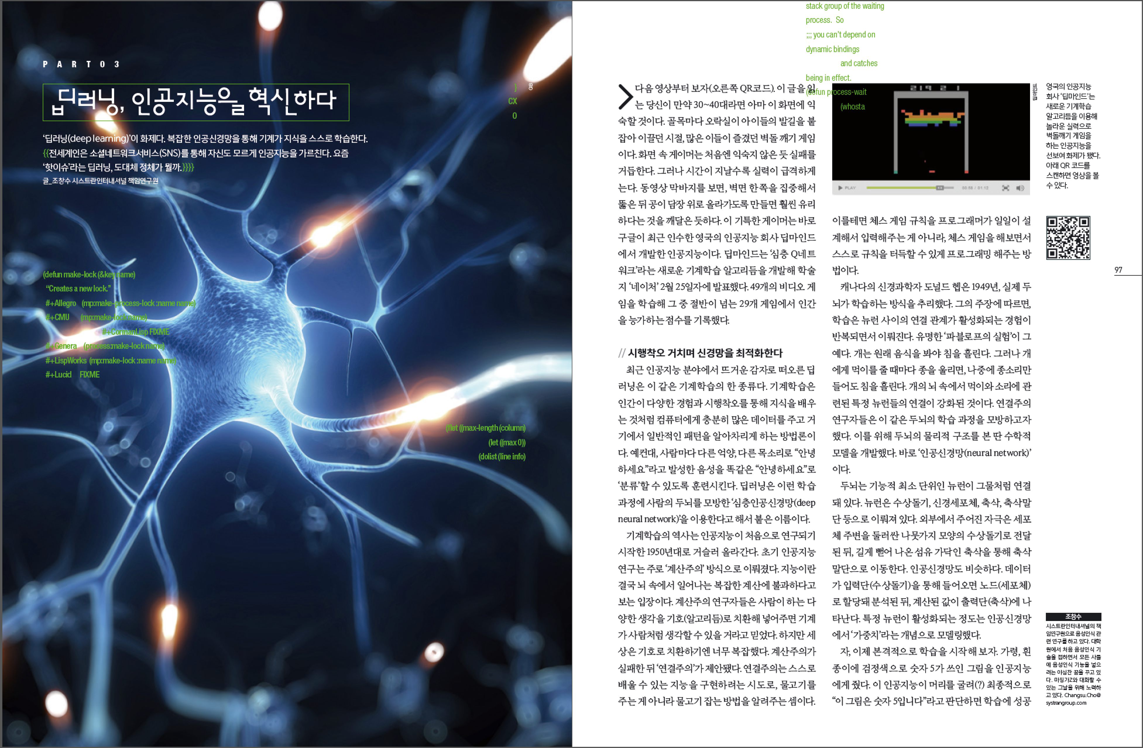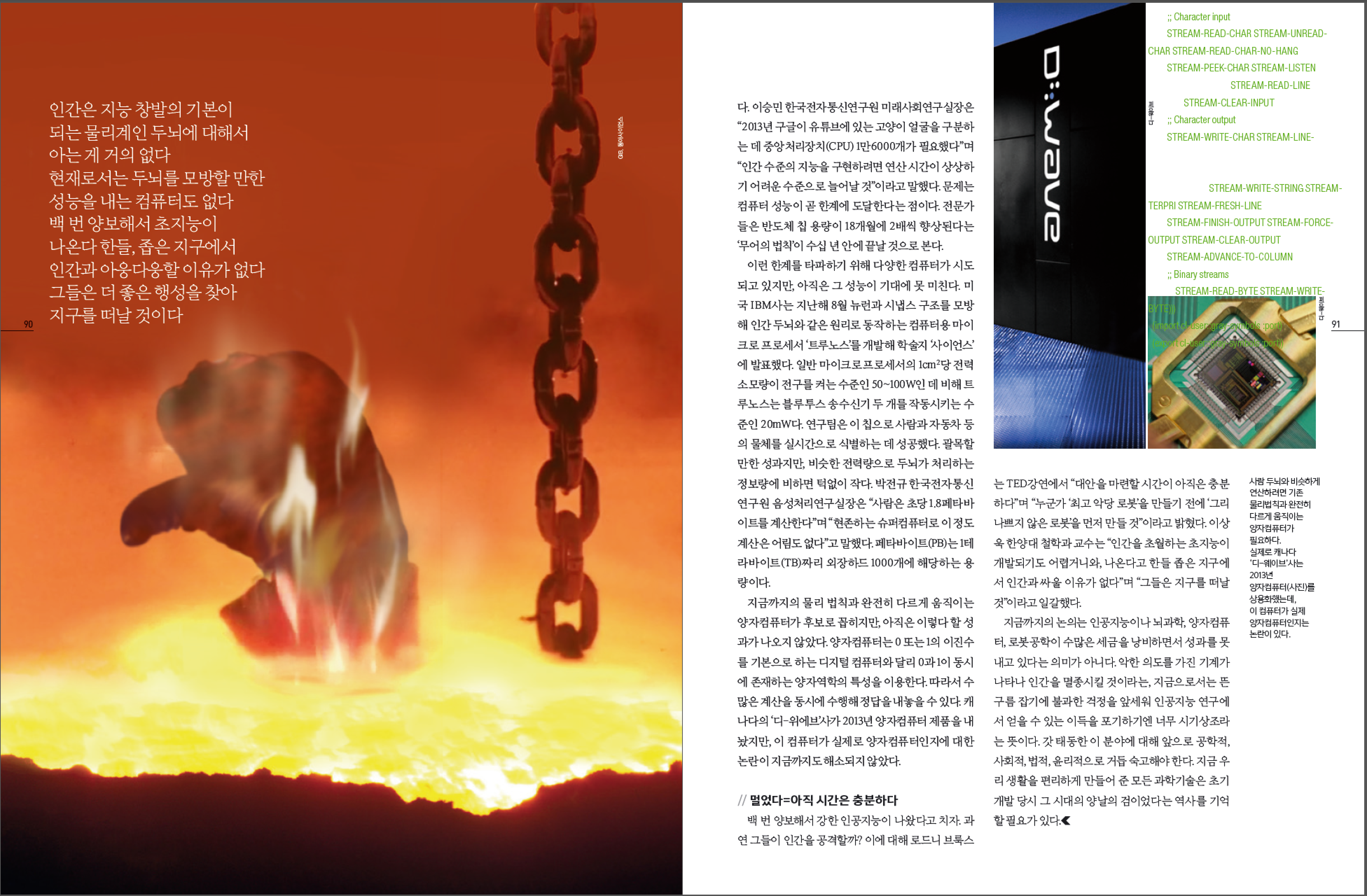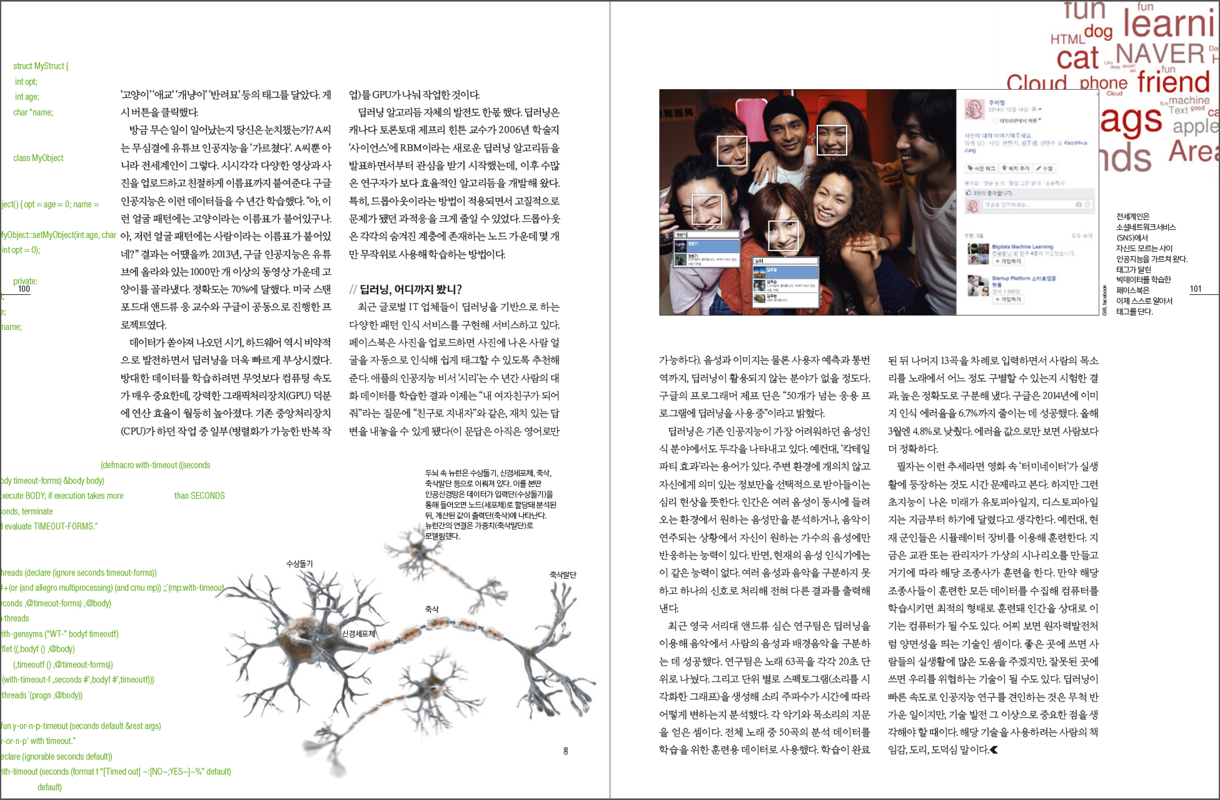 인공지능, 로봇의 느낌을 표현하기 위해 코드를 사용하여 본문 중간중간에 비주얼 소스로 사용했고 탈폰트(?)를 사용하여 각 음절이 코드처럼 보이게 하기 위해 연출했다. 인공지능개발연대기 인포그래픽부분에서는 처음 이론이 나온 시점과 개발연구가 시작된 연도가 꽤 오랜텀이 있는걸 이용해 페이지의 전체 지면을 활용해 기간의 텀을 표현해보았다.