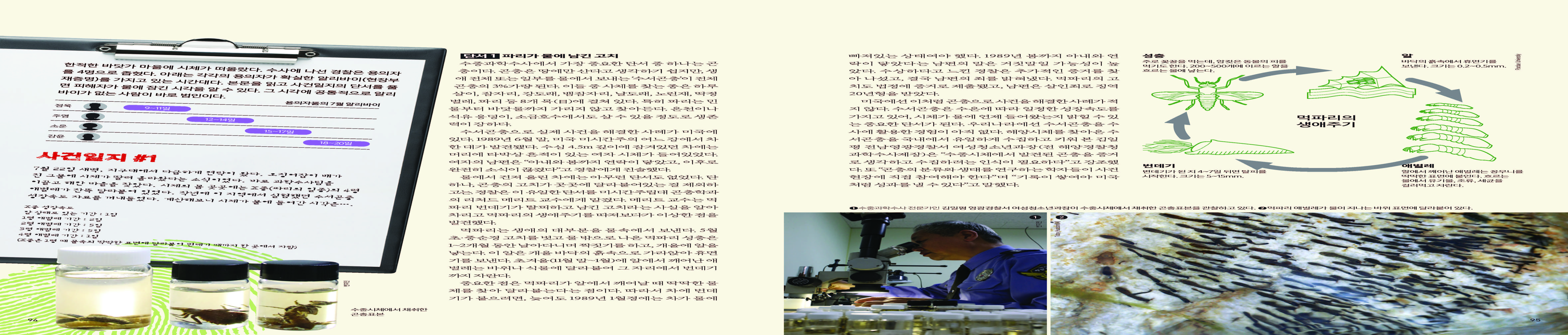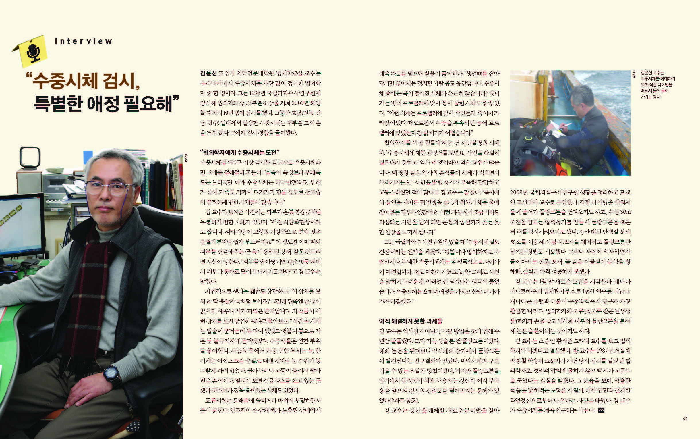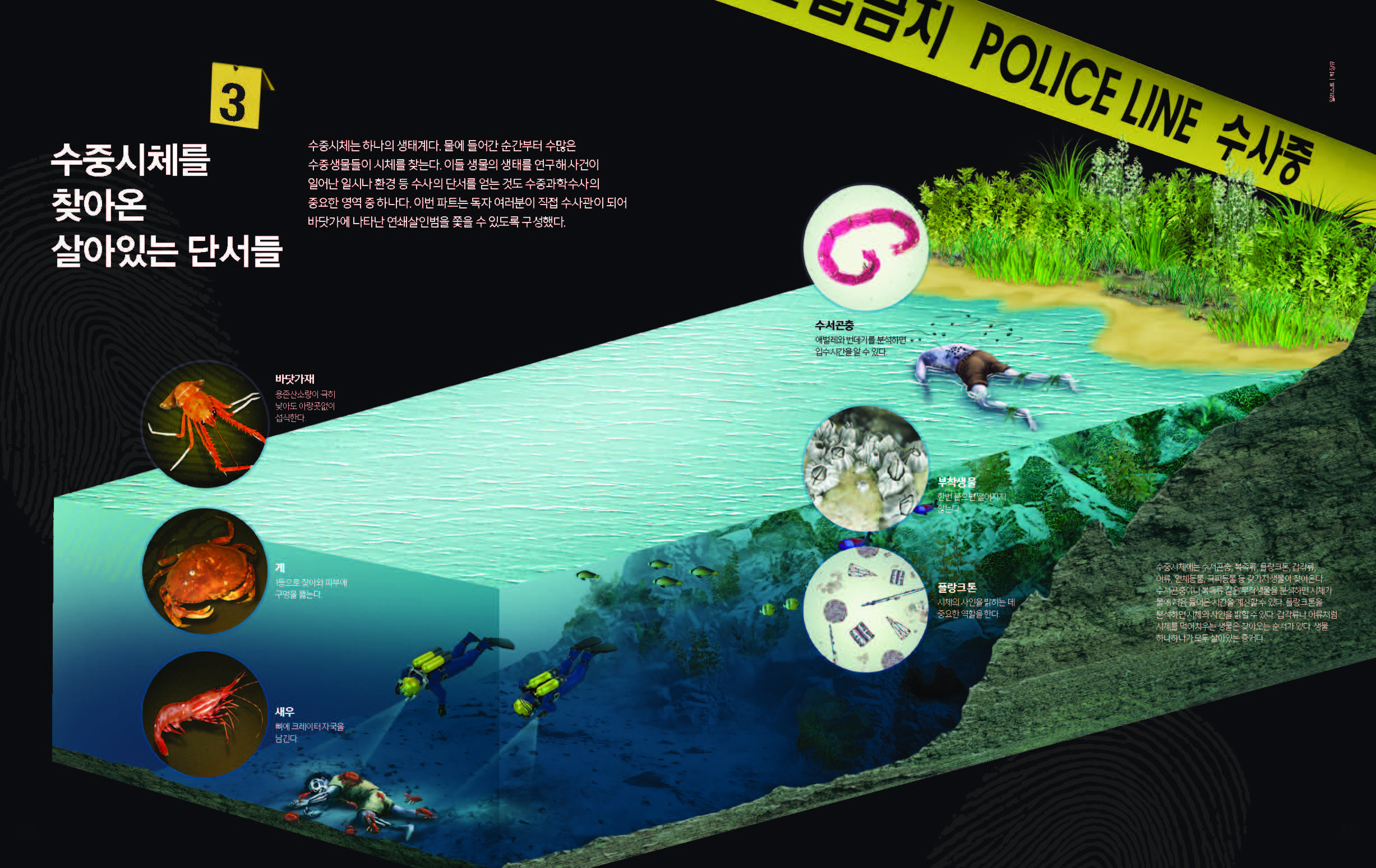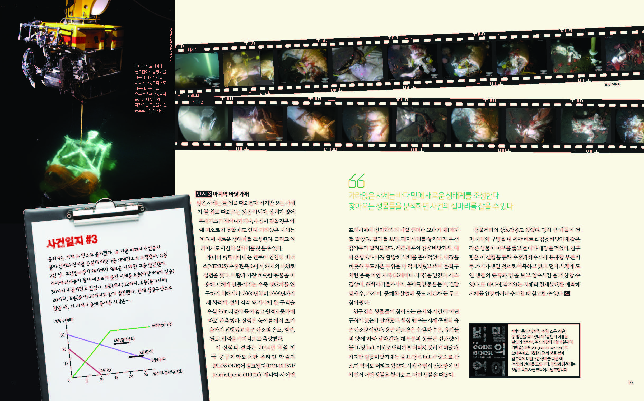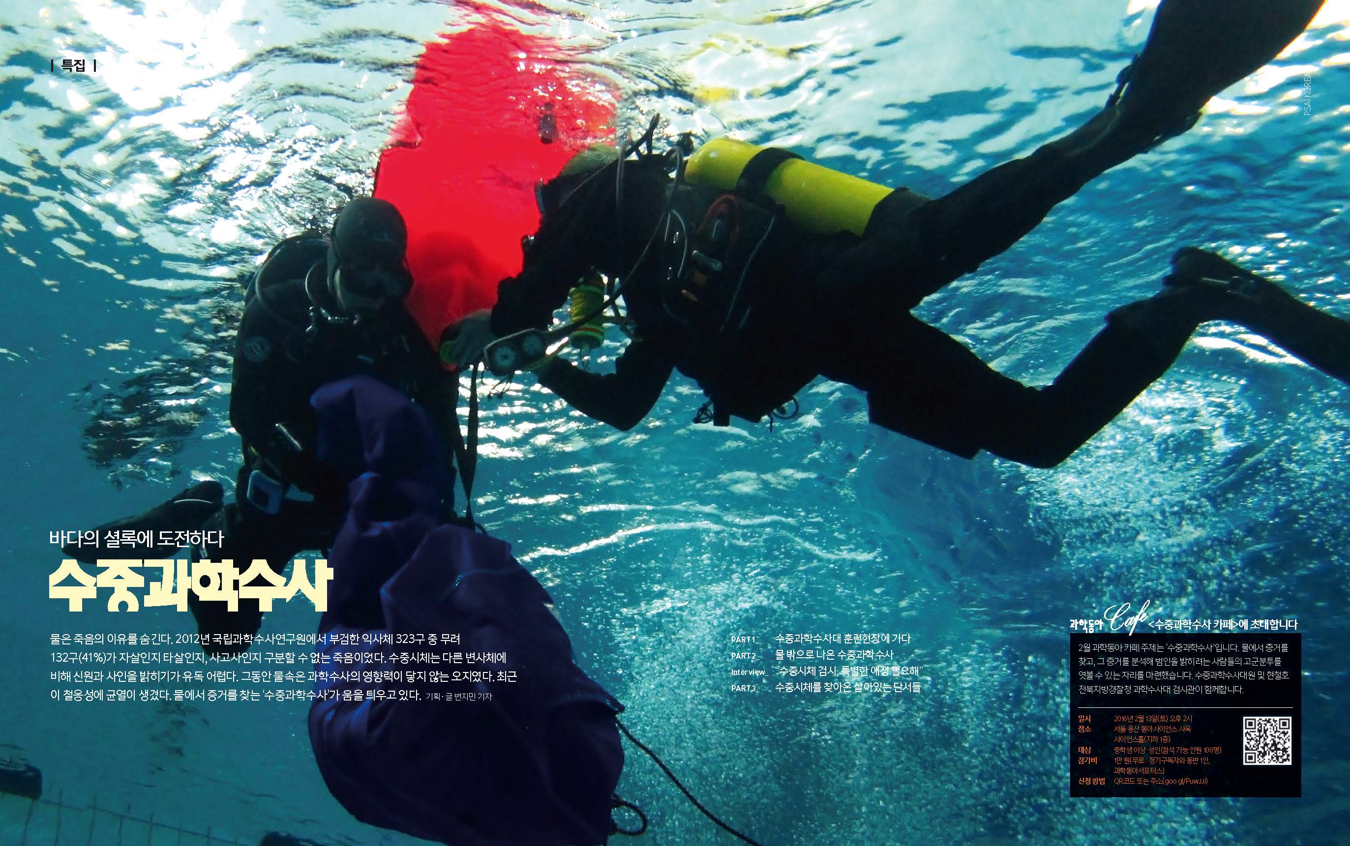 수중과학기사. 원래 이 기사는 팀장님과 실제로 수중탐사를 하는 현장을 방문해 촬영을 하기로 했었는데 출장 하루전에 임신을 알게되어 팀장님 혼자만 촬영을 보냈었다. 직접 연출을 못한 상태로 맡은 기사여서 많은 어려움이 있었다. 과학수사현장에서 지문을 뜨는 모습이 기억에 남아 지면에 지문을 군데 군데 찍어 연출을 하고 수사현장에 단골로 나오는 숫자들을 이용해 각 파트를 알렸다. 수중과학인포그래픽 부분도 한 땀 한 땀 수작업으로 제작하여 밤을 꼴딱 새게 만든 임신신고식을 하게 만든 기사로 기억된다